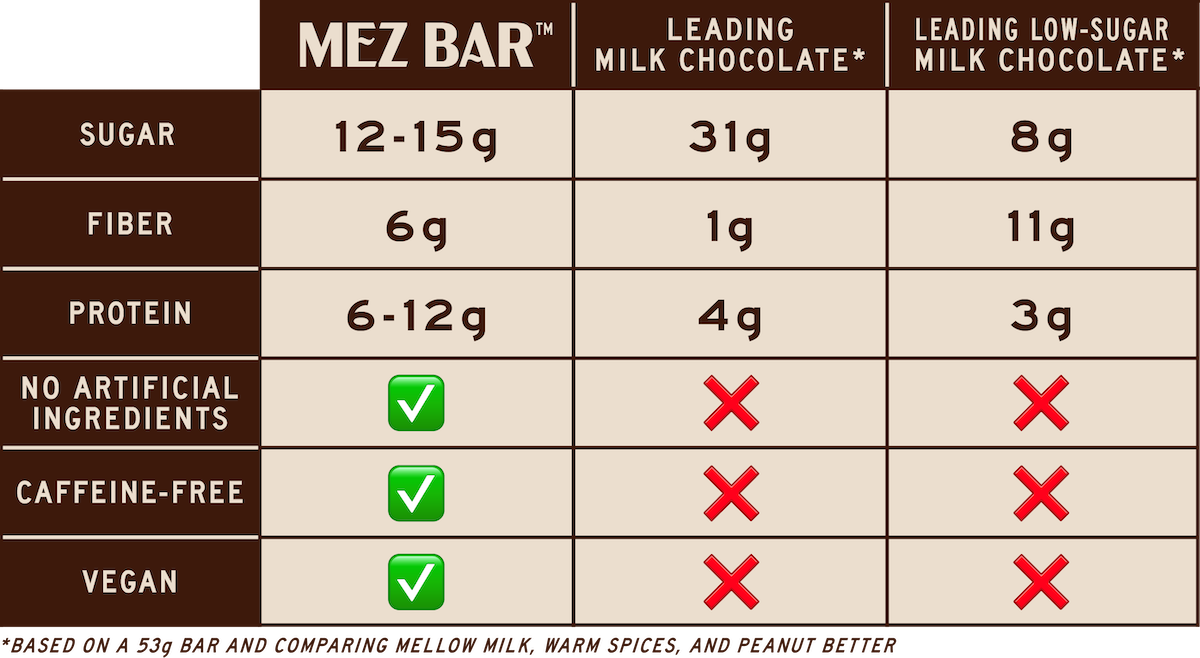 I've been trying to lessen my caffeine intake and find a chocolate replacement. Mez's texture, the consistency, the snap, the smell...all great. I especially like the salt in the peanut bar. It really lifts it. And the warm spice flavor is very yummy. I enjoy the Mellow Milk as well, but am finding I'm more attracted to the more pungent flavors. I love the ingredients and love how the bars are "packaged with purpose."
