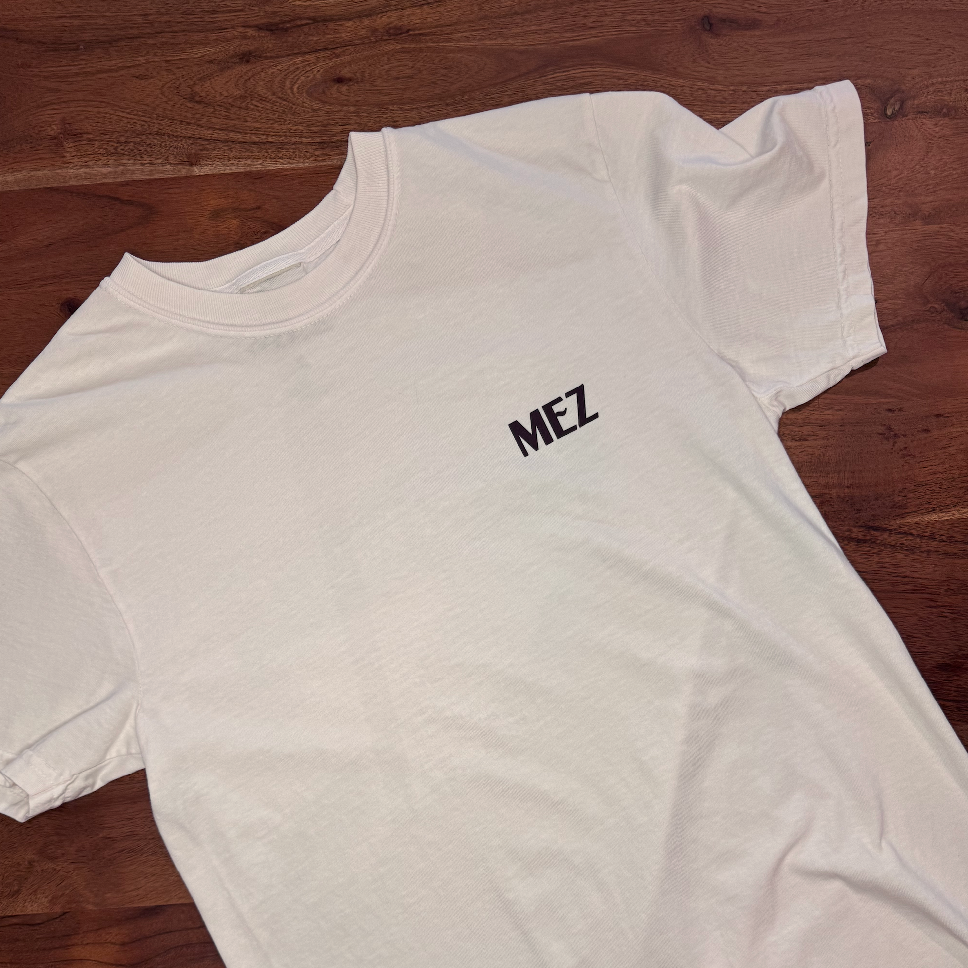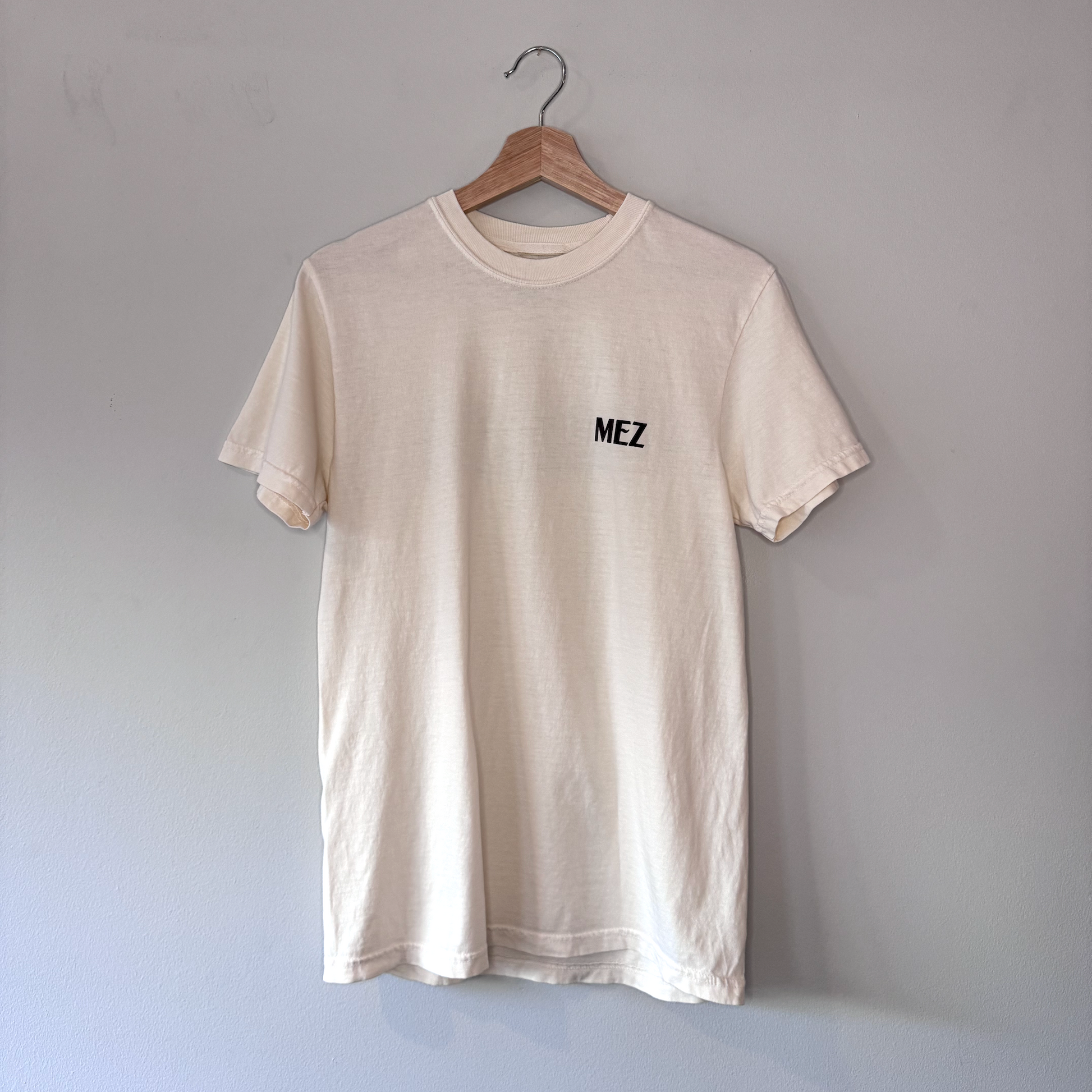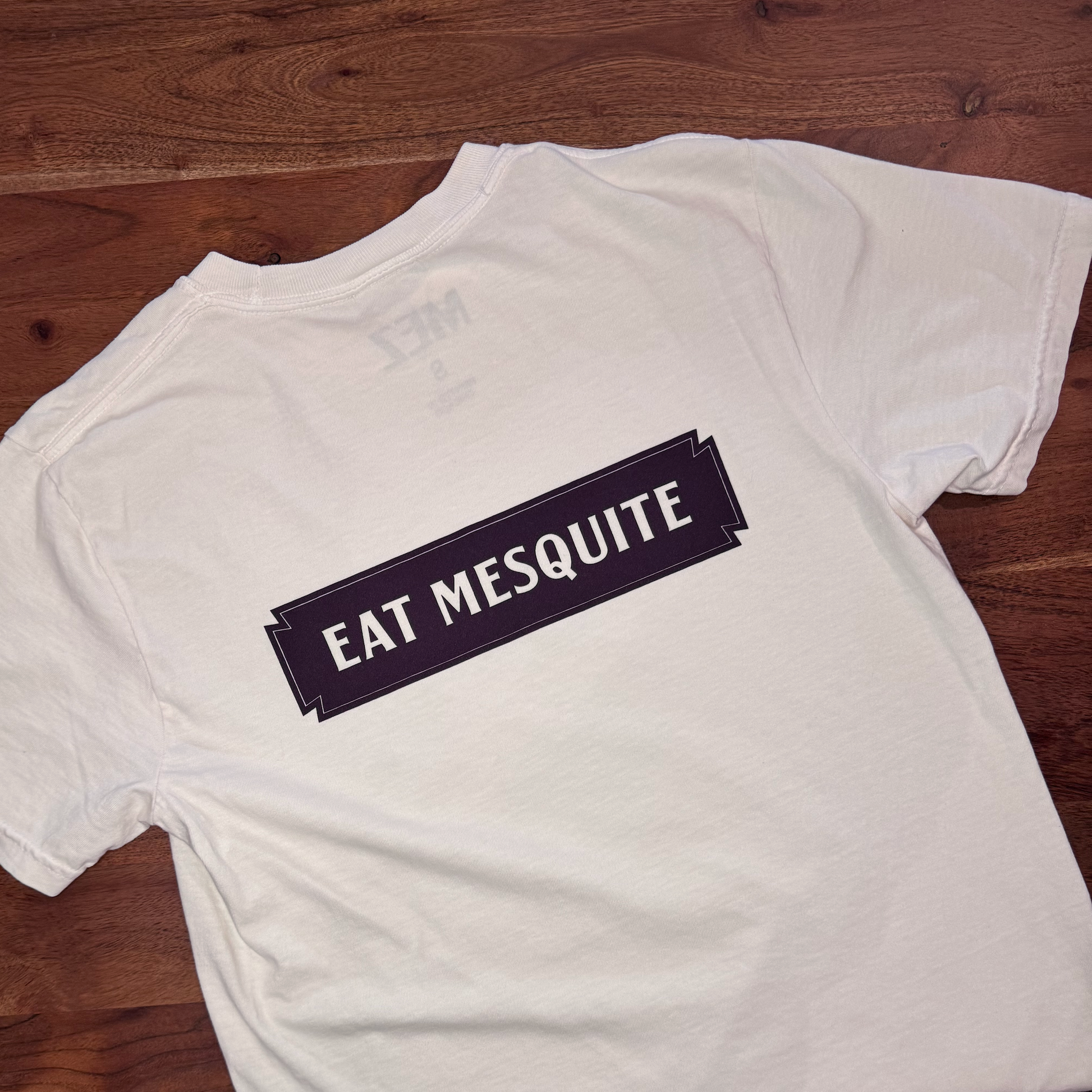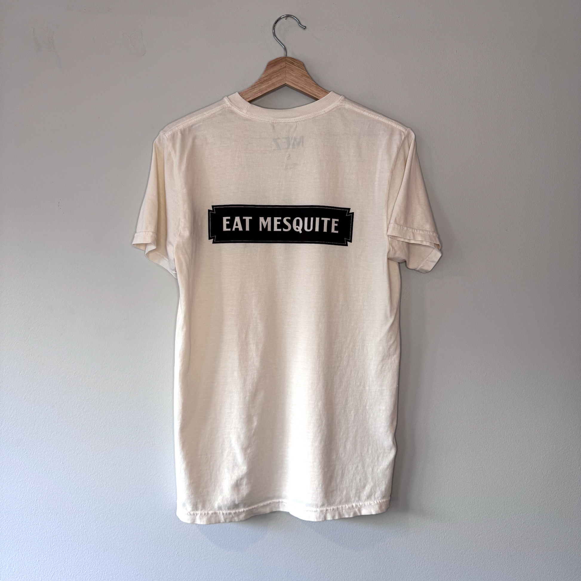 Beige short sleeve tee with signature Mez logo on the front and Eat Mesquite slogan on the back.