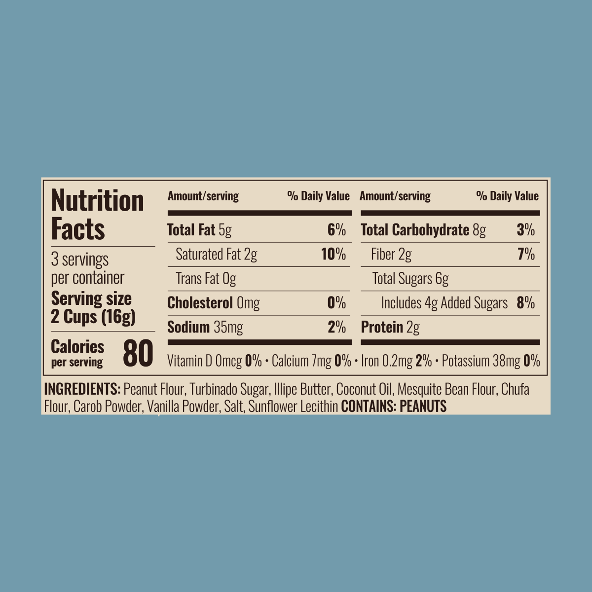 Peanut Flour, Turbinado Sugar, Illipe Butter, Coconut Oil, Mesquite Bean Flour, Chufa Flour, Carob Powder, Vanilla Powder, Salt, Sunflower Lecithin