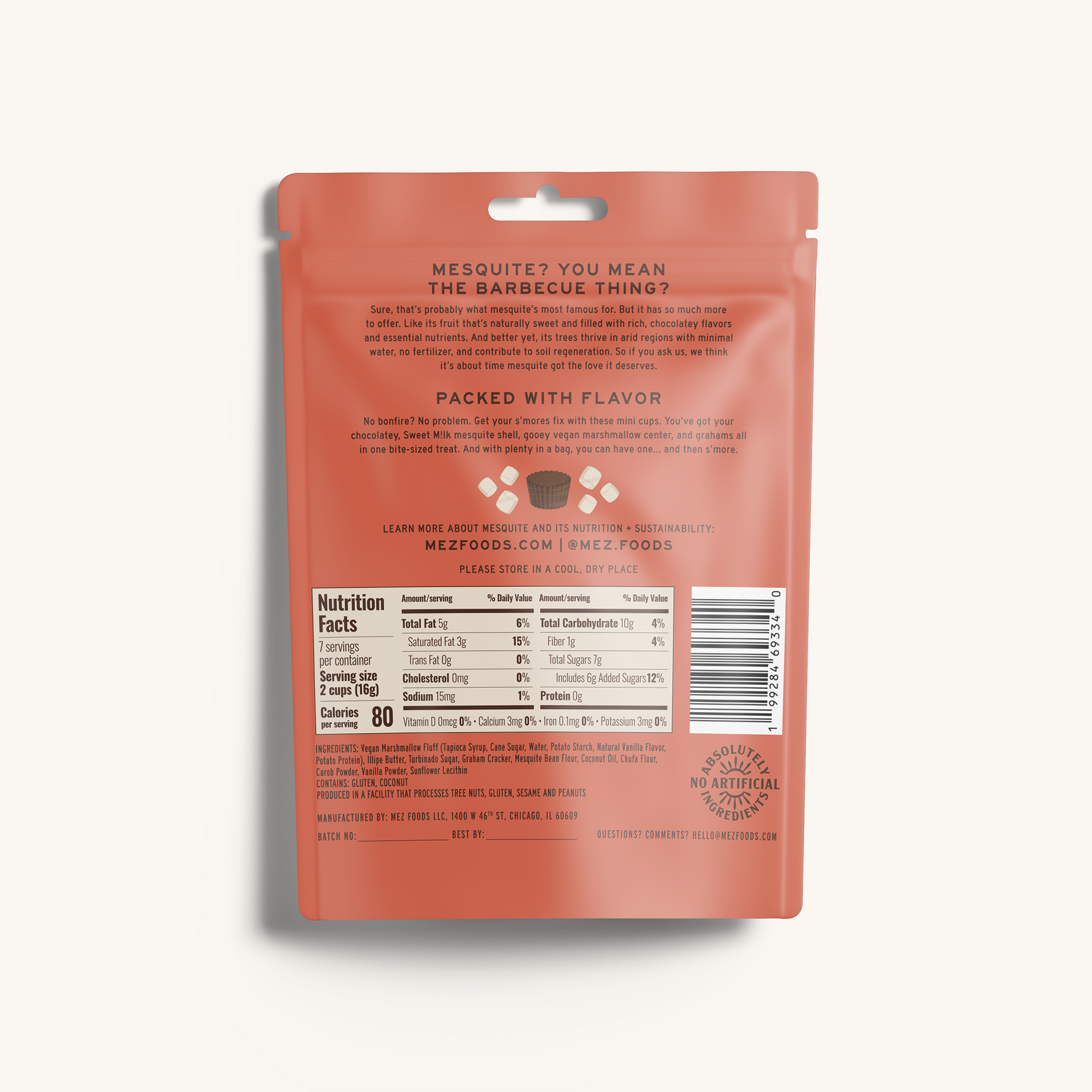 Vegan Marshmallow Fluff (Tapioca Syrup, Cane Sugar, Water, Potato Starch, Natural Vanilla Flavor, Potato Protein), Illipe Butter, Turbinado Sugar, Graham Cracker, Mesquite Bean Flour, Coconut Oil, Chufa Flour, Carob Powder, Vanilla Powder, Sunflower Lecithin