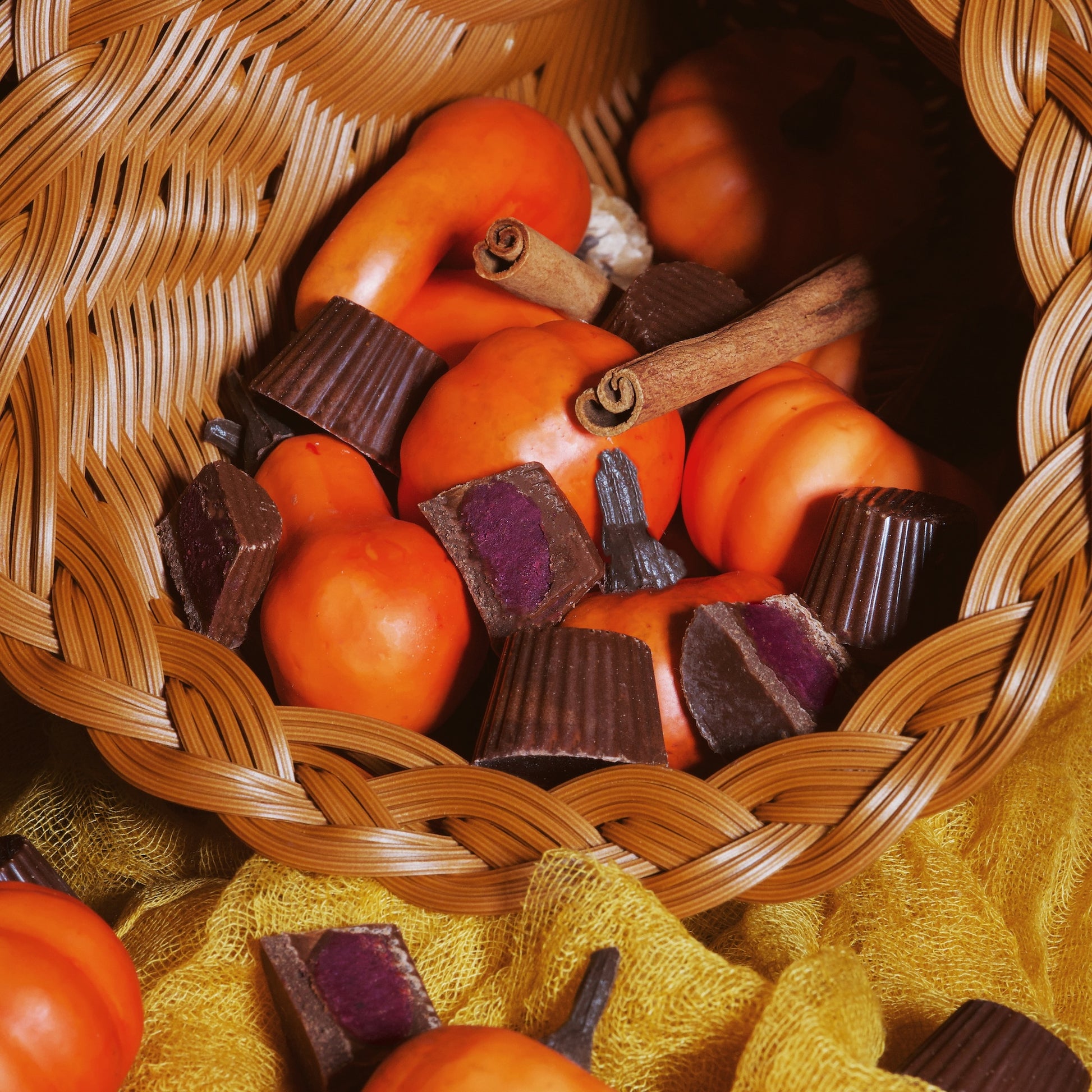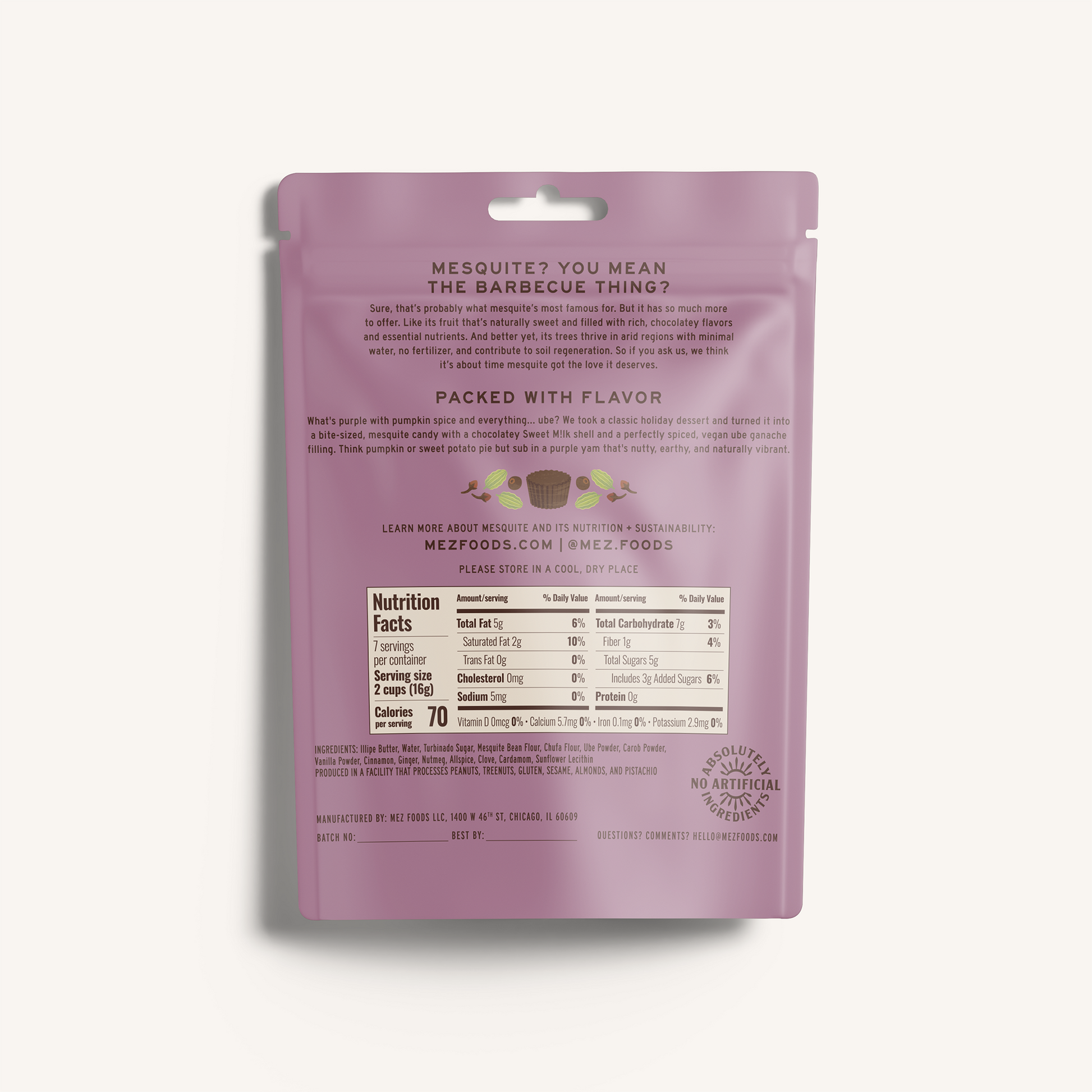 What's purple with pumpkin spice and everything... ube? We took a classic holiday dessert and turned it into a bite-sized, mesquite candy with a cocoa-free, chocolatey Sweet M!lk shell and a perfectly spiced, vegan ube ganache filling. Think pumpkin or sweet potato pie but sub in a purple yam that's nutty, earthy, and naturally vibrant.