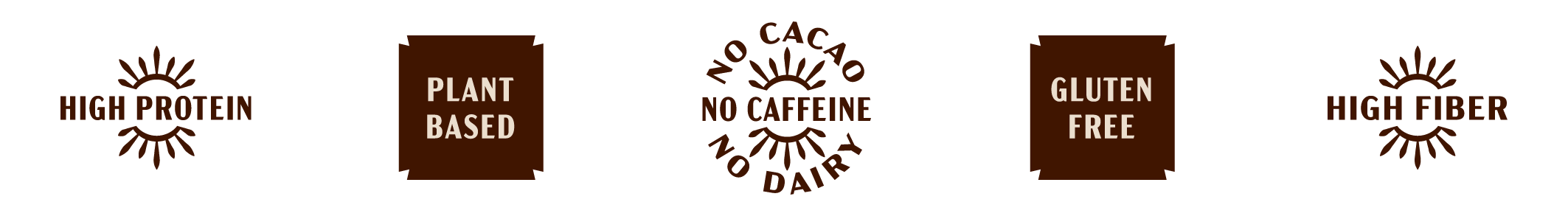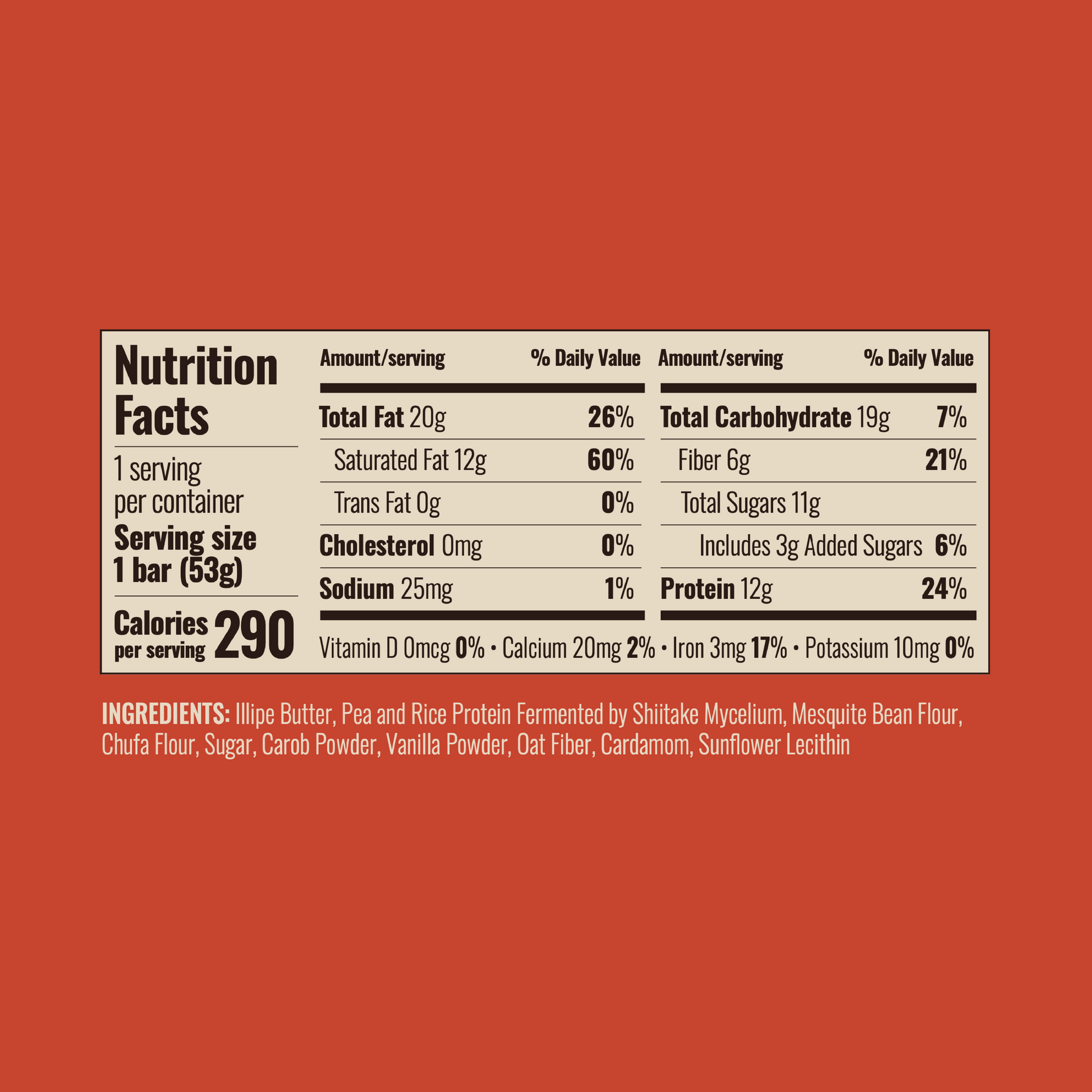 Illipe Butter, Pea and Rice Protein Fermented by Shiitake Mycelium, Mesquite Bean Flour, Chufa Flour, Sugar, Carob Powder, Vanilla Powder, Oat Fiber, Cardamom, Sunflower Lecithin