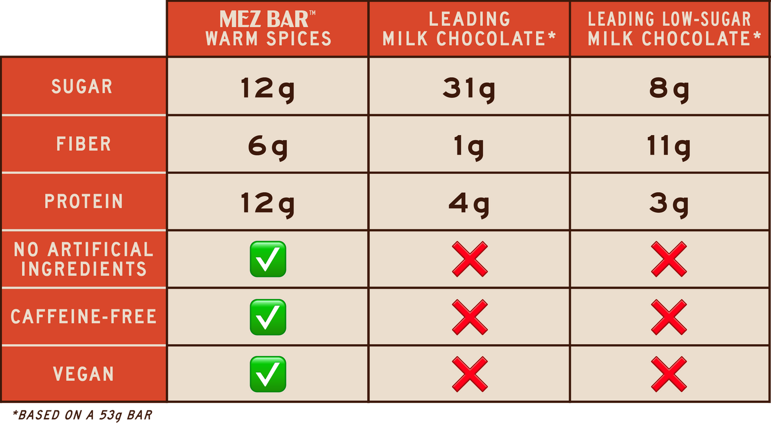 Our Mez™ Bar packs a serious nutritional punch. Thanks to our namesake ingredient, mesquite, it’s got protein, fiber, calcium, amino acids, and antioxidants out the wazoo, all without any of the caffeine or other stimulants found in cacao. This means it tastes like a treat, but that it’s healthy enough to enjoy all the time. A real "have your cake and eat it too" moment, you guys.